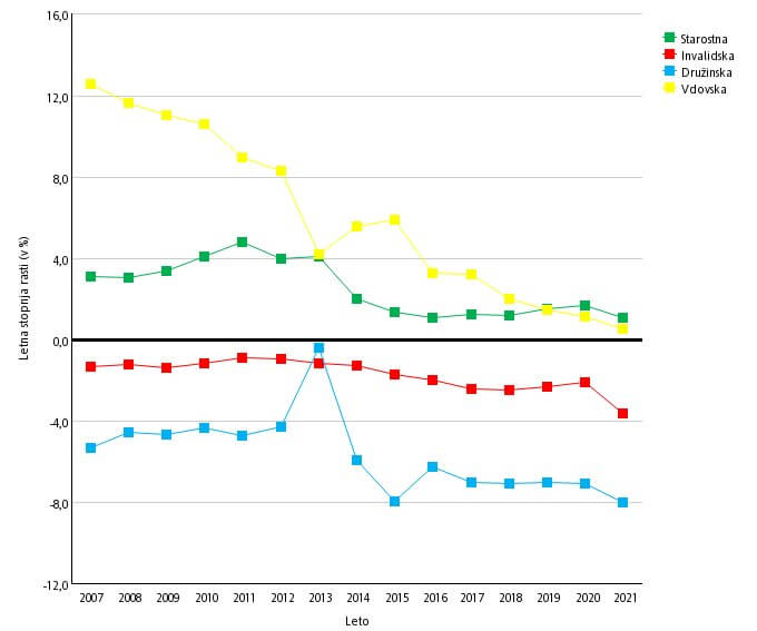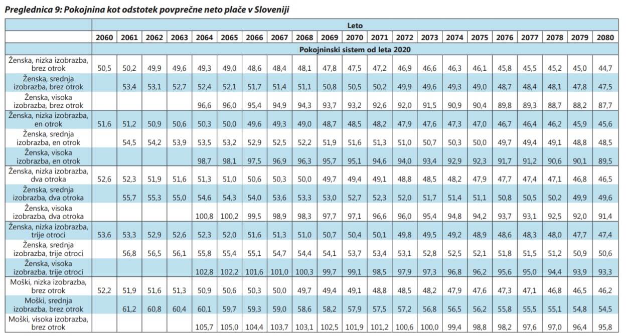 Pokojnine v zadnjih letih niso rasle sorazmerno s plačami. Neto starostna pokojnina je leta 2000 predstavljala 75,3% neto plače, leta 2010 64,7%, leta 2020 pa le še 57%. To pomeni, da je pokojnina povprečno vsako leto predstavljala 1 % plače manj. Pokojnine v prihodnosti je sicer zelo težko napovedovati, vendar je v naslednji tabeli predvideno razmerje med povprečnimi neto plačami in pokojninami za človeka rojenega leta 2000 glede na spol, izobrazbo in število otrok.