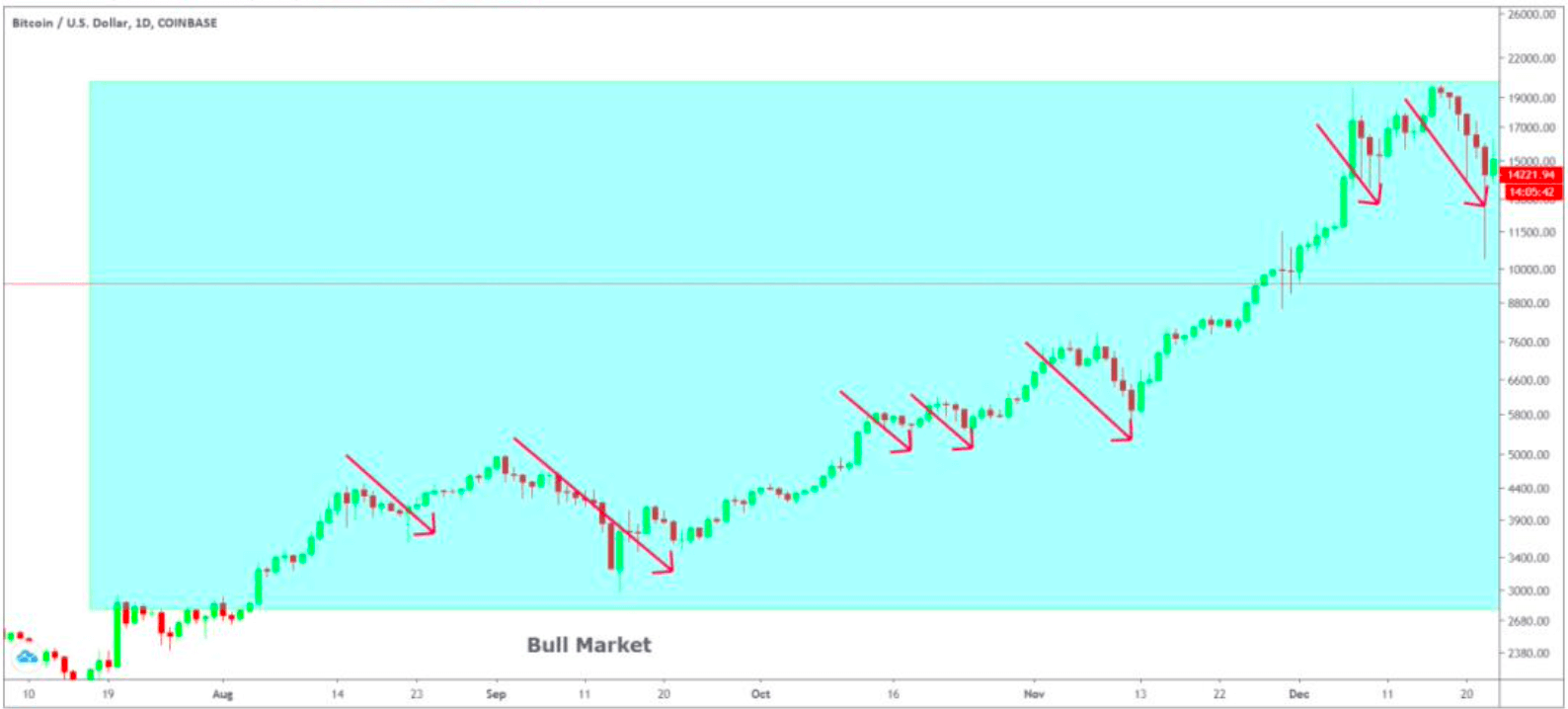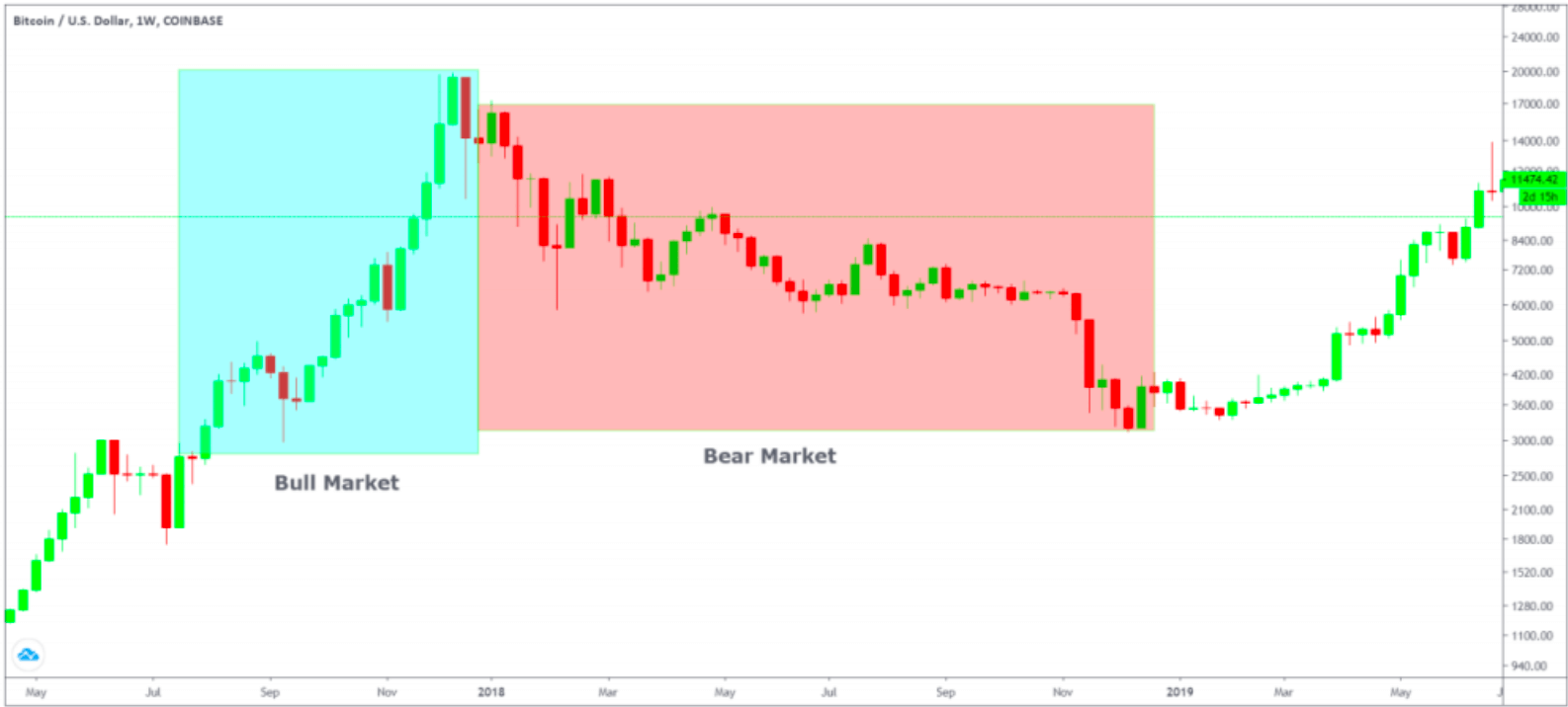 Za vsakega trgovca je skrajno pomembno kakšne so trenutne razmere na trgu, saj to direktno vpliva na portfelij vsakega vlagatelja. V svetu vlaganja poznamo dva izraza s katerima opisujemo trenutne tržne razmere in potencial; »bikovski« in »medvedji« trg. »Bikovski trg« ima lahko veliko »medvedjih« ciklov in obratno, kot je prikazano spodaj.