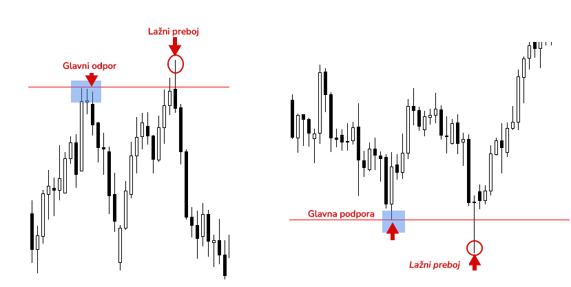 Pri lažnem preboju se cena začasno premakne nad ali pod ključno raven podpore ali upora, nato pa se pozneje umakne nazaj na isto stran, kjer je bila začeta. To je najslabši scenarij za prebojnega trgovca, ki vstopi v pozicijo takoj, ko se cena zlomi.
