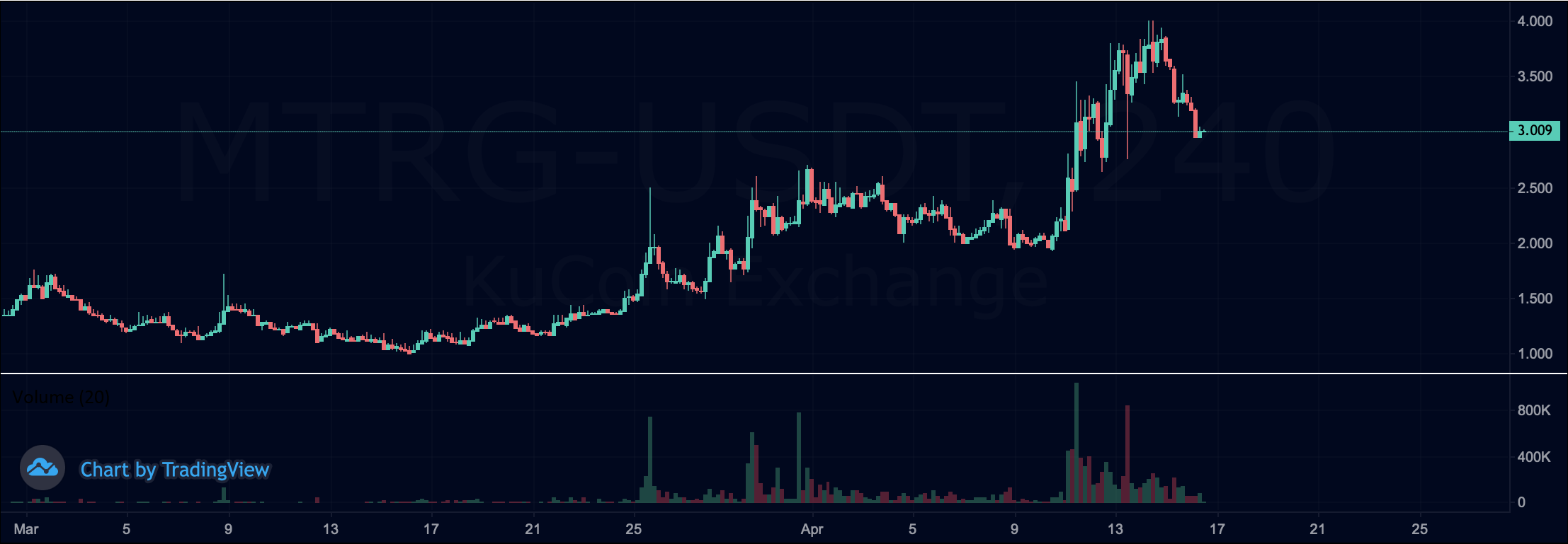 Iz grafikona spodaj lahko vidimo da je skok v količini trgovanja vodil k zvišanju cene v naslednjih dneh, kot tudi povečano zanimanje trgovanega sredstva na borzi.