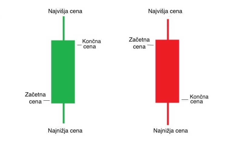 Sveča je odebeljena med začetno in končno ceno v izbranem časovnem obdobju, kjer zelena barva sveče označuje, da je končna cena višja kot začetna. V nasprotnem primeru je sveča rdeča. Kot dodatek, pa nam tanjša konca sveče prikazujeta najnižjo in najvišjo doseženo vrednost v našem časovnem obdobju.