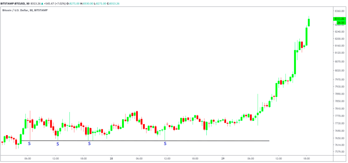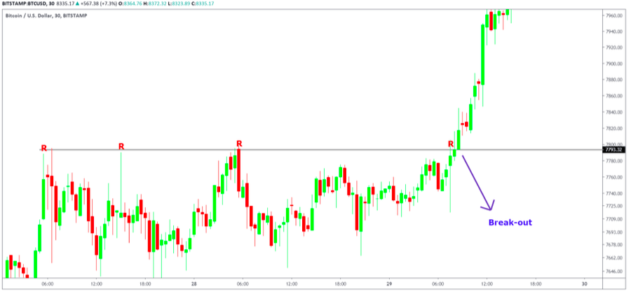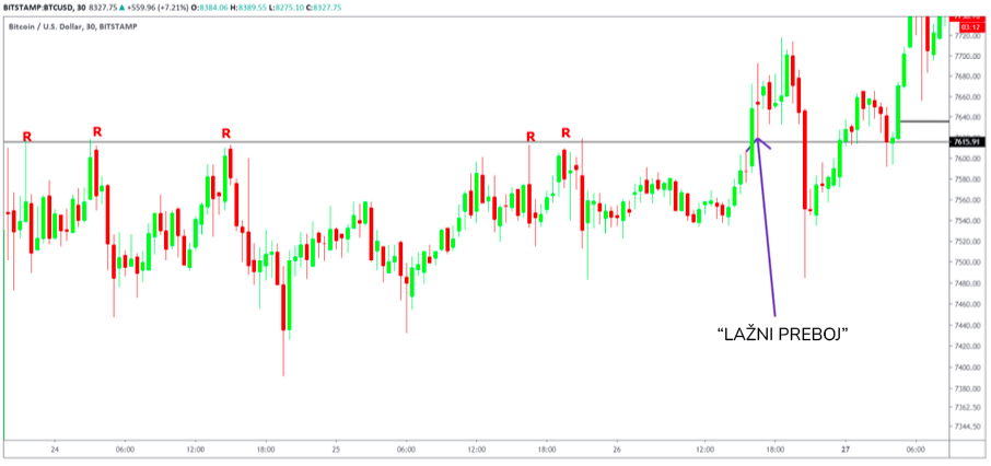Kot vidimo na sliki zgoraj, cena Bitcoina prebije odporno linijo in se nato hitro vrne pod njo. Temu pravimo »fake break-out« ali lažni preboj. Do pravega preboja pride, ko je linija odpora večkrat testirana, kar vodi do povečanega povpraševanja v tem cenovnem območju in tako pridemo do preboja območja, kot je vidno na sliki spodaj.
