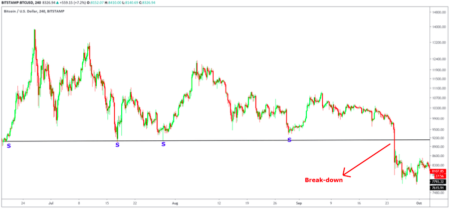 Break-down gre za enak princip, kjer je območje podpore prevečkrat testirano oz. preizkušeno, kar vodi do povečanja ponudbe na tej cenovni točki in tako znižanje cen.